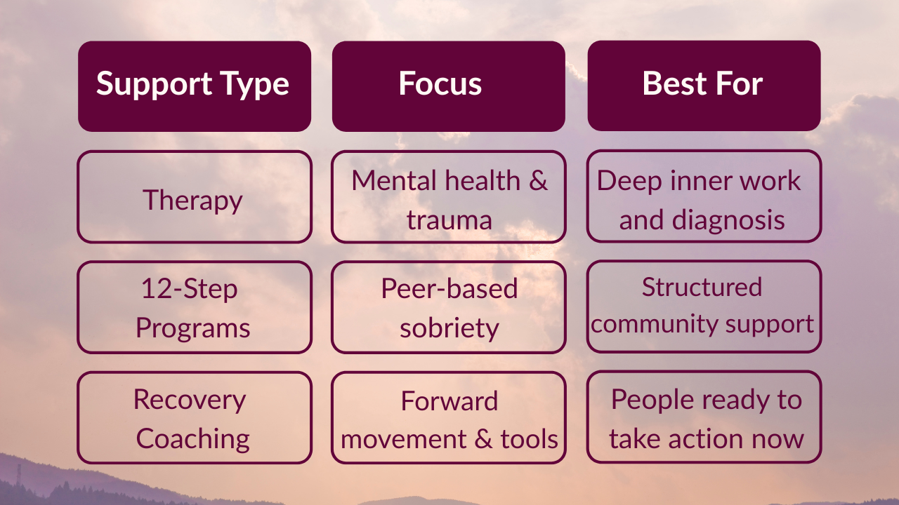 Recovery coaching is not a replacement for therapy or medical treatment when needed—but it can be an incredibly powerful alternative or supplement to other approaches.
