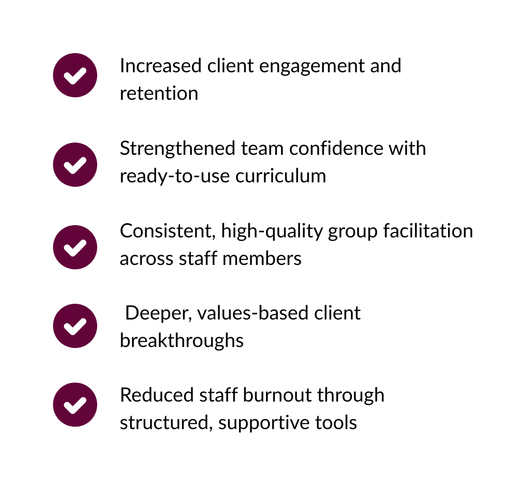 With a blend of psychoeducation, personal growth tools, and practical life skills, this program empowers your team to facilitate deeper transformation. It also supports your staff with structured lesson plans, facilitator prep guides, and proven coaching frameworks, reducing burnout and making group facilitation more engaging and impactful.