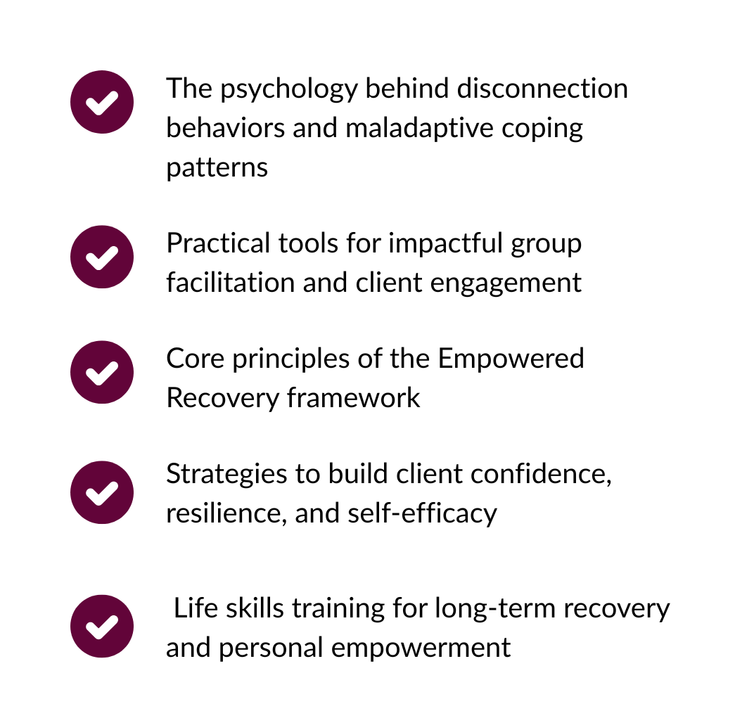 Most recovery programs focus on stopping harmful behaviors, but lasting change comes from helping clients reconnect with their values, strengths, and sense of self. The Empowered Recovery Curriculum is designed to guide clients in identifying and releasing disconnection behaviors, avoidance patterns, and maladaptive coping strategies—while developing emotional resilience, healthy habits, and a clear vision for their future.