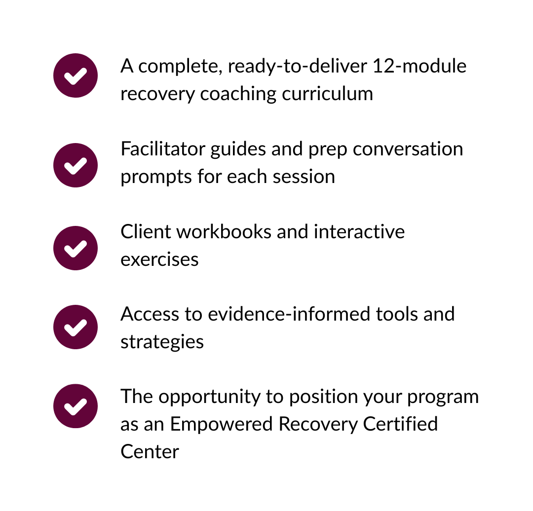 The Empowered Recovery Experience equips your team with a structured, evidence-informed program designed to enhance engagement, deepen transformation, and sustain long-term recovery for your clients. This curriculum builds on your staff’s existing strengths and introduces practical tools, facilitator guides, and client workbooks to streamline delivery and create consistent, high-quality programming.